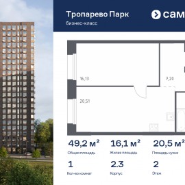 Строим кварталы для жизни с заботой о будущем. Предлагаются 1-комнатные апартаменты бизнес-класса 49, 23 кв.м в корпусе 2.3 на 2 этаже, в МФК «Тропарево Парк» Апартаменты с чистовой отделкой. Доступность дополнительных опций уточняйте у застройщика. Прописка не предусмотрена в...