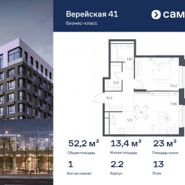 Строим кварталы для жизни с заботой о будущем. Предлагается 1-комнатная квартира бизнес-класса 52, 17 кв.м в корпусе 2.2 на 13 этаже, в «Верейская 41» Квартира без отделки. Доступность опции «отделка» и возможность комплектации мебелью и декором уточняйте у...
