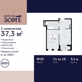 1-комн. квартира с предчистовой отделкой в ЖК "Дом на Зорге" на 15 этаже. Общая площадь: 37.3 кв.м., жилая: 13.5 кв.м., площадь просторной кухни-столовой: 10.7 кв.м. Все окна выходят на одну сторону. В квартире одна лоджия, один совмещенный санузел. Высота потолков 3.1 м. Имеется ниша под...