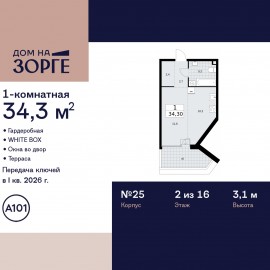 Продается однокомнатная квартира-студия от застройщика с отделкой в ЖК "Дом на Зорге" на 2 этаже. Общая площадь: 34.3 кв.м., площадь гостиной 21.8 кв.м., из которых 10.2 кв.м. выделено под кухонную зону. Все окна выходят на одну сторону. В квартире один балкон, один совмещенный...