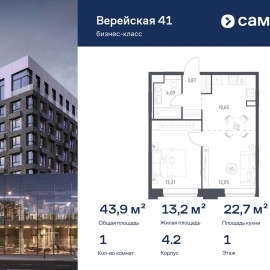 Строим кварталы для жизни с заботой о будущем. Предлагается 1-комнатная квартира бизнес-класса 43, 87 кв.м в корпусе 4.2 на 1 этаже, в «Верейская 41» Квартира без отделки. Доступность опции «отделка» и возможность комплектации мебелью и декором уточняйте у...