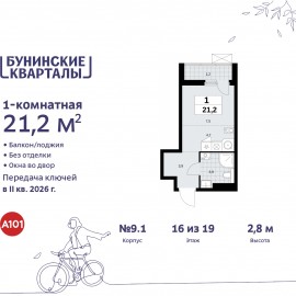 Однокомнатная квартира-студия в ЖК "Бунинские кварталы" на 16 этаже. Квартира без отделки, после оформления собственности можно делать ремонт. Общая площадь: 21.2 кв.м., площадь гостиной 12.2 кв.м., из которых 4.7 кв.м. выделено под кухонную зону. Все окна выходят на одну сторону. В...