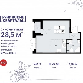 Однокомнатная квартира-студия от застройщика в ЖК "Бунинские кварталы" на 8 этаже. Квартира без отделки, полностью готова к ремонту. Общая площадь: 28.5 кв.м. Высота потолков 2.99 м. Квартира будет сдана без отделки. Установлены стеклопакеты с повышенной тепло- и шумоизоляцией,...