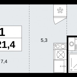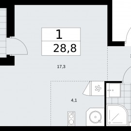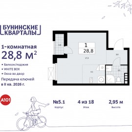 1-комн. квартира-студия с предчистовой отделкой в ЖК "Бунинские кварталы" на 4 этаже. Общая площадь: 28.8 кв.м., площадь гостиной 21.4 кв.м., из которых 4.1 кв.м. выделено под кухонную зону. Все окна выходят на одну сторону. В квартире одна лоджия, один совмещенный санузел. Высота...