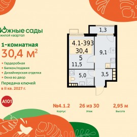 Однокомнатная квартира с отделкой в ЖК "Южные сады" на 26 этаже. Общая площадь: 30.4 кв.м., жилая: 11.5 кв.м., площадь просторной кухни-столовой: 9.1 кв.м. Все окна выходят на одну сторону. В квартире один балкон, один совмещенный санузел. Высота потолков 2.95 м. Имеется ниша под...