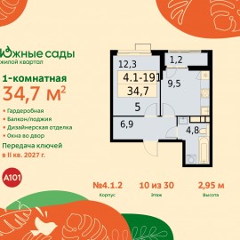 1-комн. квартира с отделкой в ЖК "Южные сады" на 10 этаже. Общая площадь: 34.7 кв.м., жилая: 12.3 кв.м., площадь просторной кухни-столовой: 9.5 кв.м. Все окна выходят на одну сторону. В квартире одна лоджия, один совмещенный санузел. Высота потолков 2.95 м. Имеется ниша под гардероб. Дом...