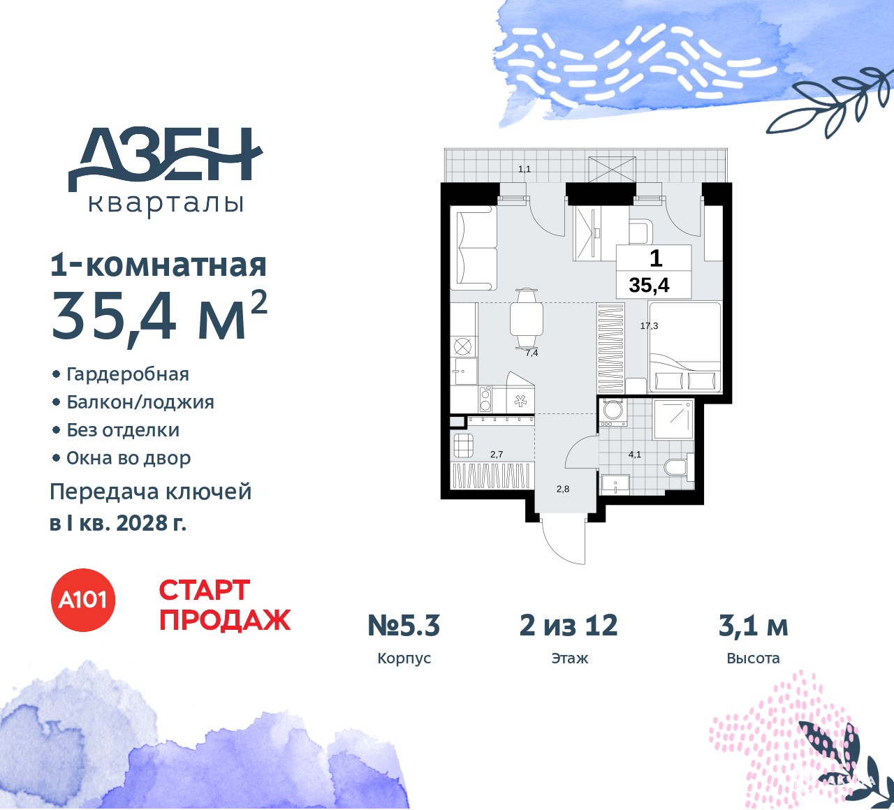 1-комн. квартира бизнес-класса-студия в ЖК "Дзен-кварталы" на 2 этаже. Квартира без отделки, полностью готова к ремонту. Общая площадь: 35.4 кв.м., площадь гостиной 24.7 кв.м., из которых 7.4 кв.м. выделено под кухонную зону. Все окна выходят на одну сторону. В квартире один балкон, один совмещенный санузел. Высота потолков 3.1 м.