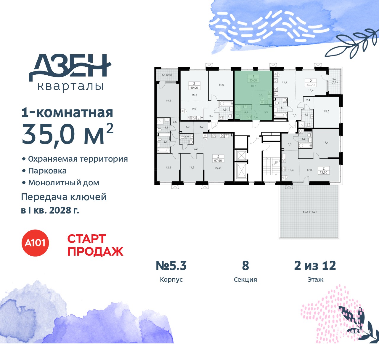 Дом монолитный, трехподъездный, переменной этажности, от 8 до 12 этажей. Квартира находится в 3-й секции высотой 12 этажей в корпусе бизнес-класса 5.3. На этаже 5 квартир. В подъезде 1 пассажирский и 1 грузовой лифт. Начало строительства - 3 квартал 2025 года. Окончание строительства - 1 квартал 2028 года. Оформление сделки по договору долевого участия.