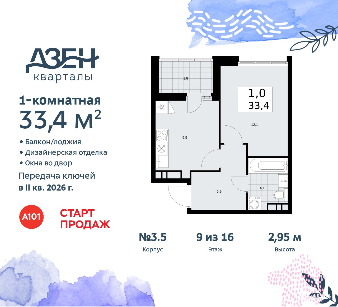 Однокомнатная квартира с предчистовой отделкой в ЖК "Дзен-кварталы" на 9 этаже. Общая площадь: 33.4 кв.м., жилая: 12.1 кв.м., площадь просторной кухни-столовой: 9.5 кв.м. Все окна выходят на одну сторону. В квартире одна лоджия, один совмещенный санузел. Высота потолков 2.95 м.