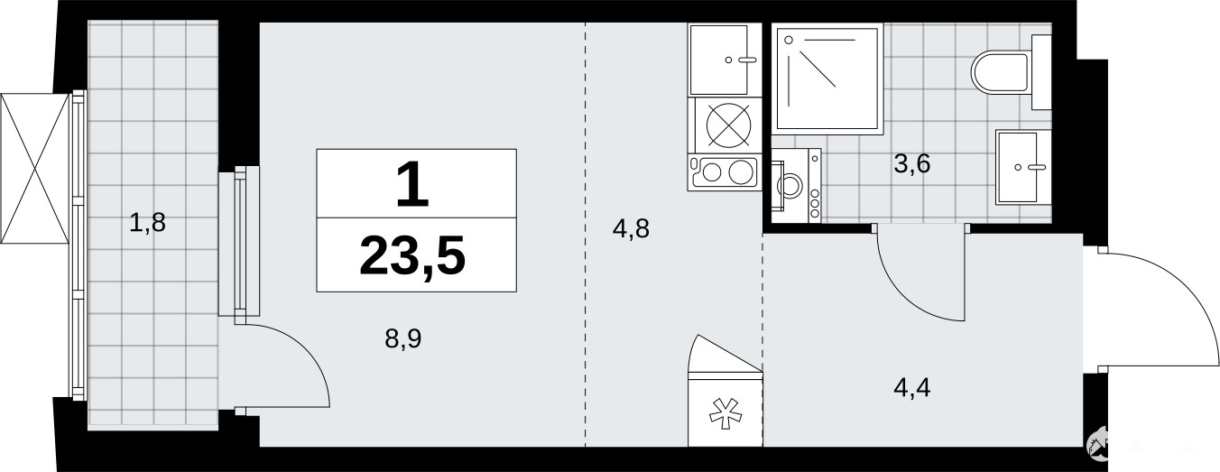 Просторная однокомнатная квартира-студия в ЖК "Дзен-кварталы" на 21 этаже. Квартира без отделки, новый собственник может сделать ремонт по индивидуальному проекту. Общая площадь: 23.5 кв.м., площадь гостиной 13.7 кв.м., из которых 4.8 кв.м. выделено под кухонную зону. Все окна выходят на одну сторону. В квартире один балкон, один совмещенный санузел. Высота потолков 2.8 м.