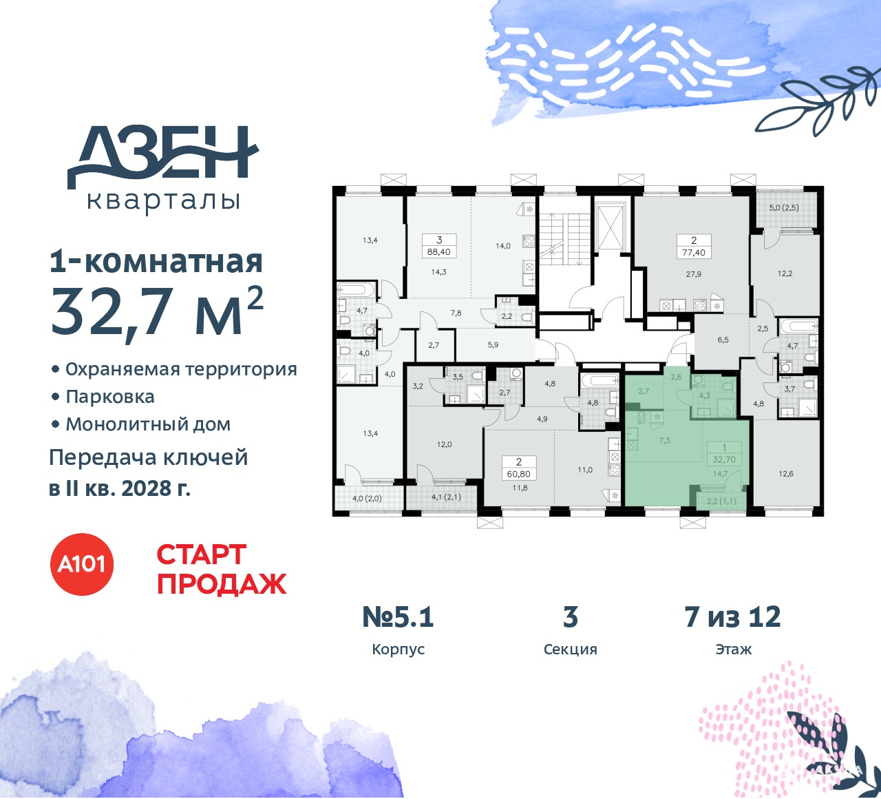 Однокомнатная квартира бизнес-класса-студия от застройщика с отделкой в ЖК "Дзен-кварталы" на 7 этаже. Общая площадь: 32.7 кв.м., площадь гостиной 21.9 кв.м., из которых 7.2 кв.м. выделено под кухонную зону. Все окна выходят на одну сторону. В квартире одна лоджия, один совмещенный санузел. Высота потолков 3.1 м.