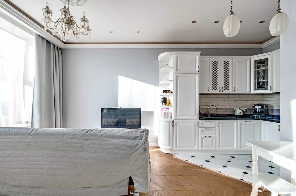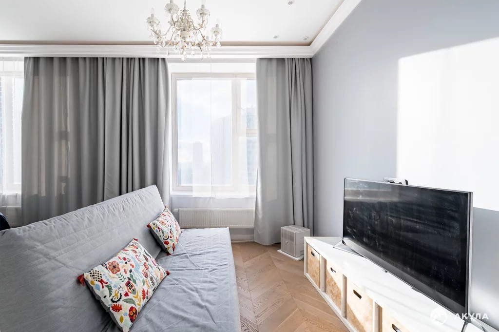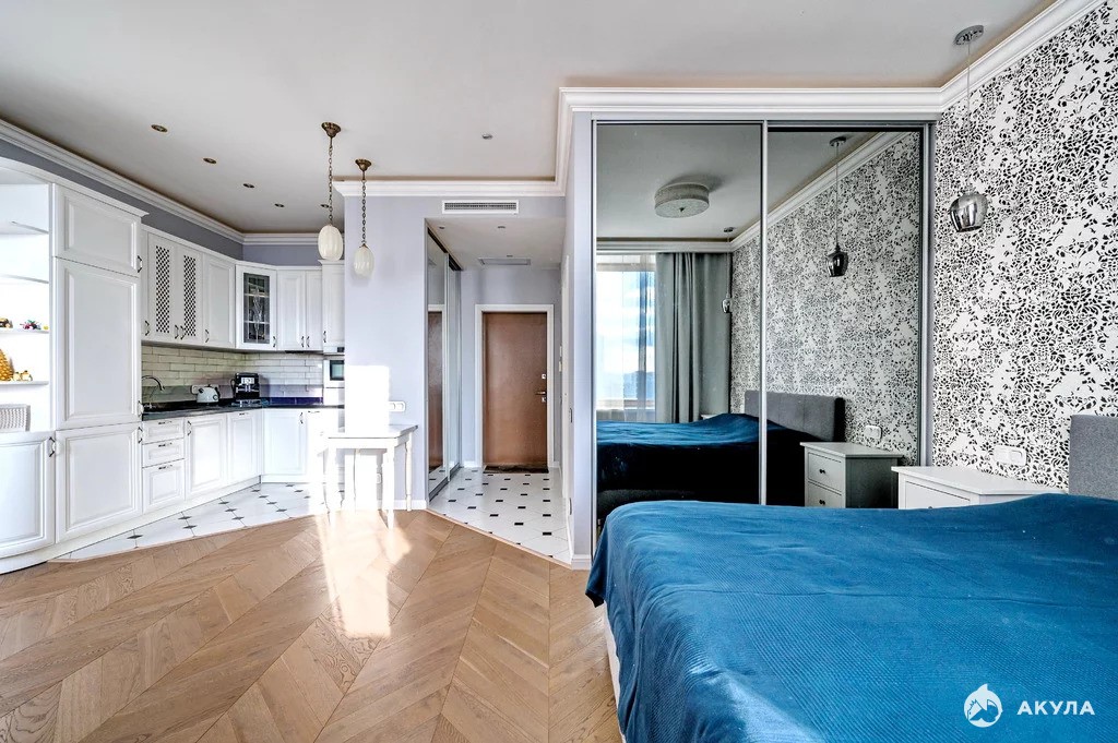 Квартира располагается на 21-м этаже, с прекрасным видом на город. Общая площадь квартиры- 36, 6 кв. м. В квартире два окна, по дизайн-проекту зону кухни-гостиной и спальни разделяет грамотно расставленная мебель. В прихожей сделан глубокий встроенный шкаф, санузел совмещенный с душевой кабиной. Высокие потолки: 3, 1 м.