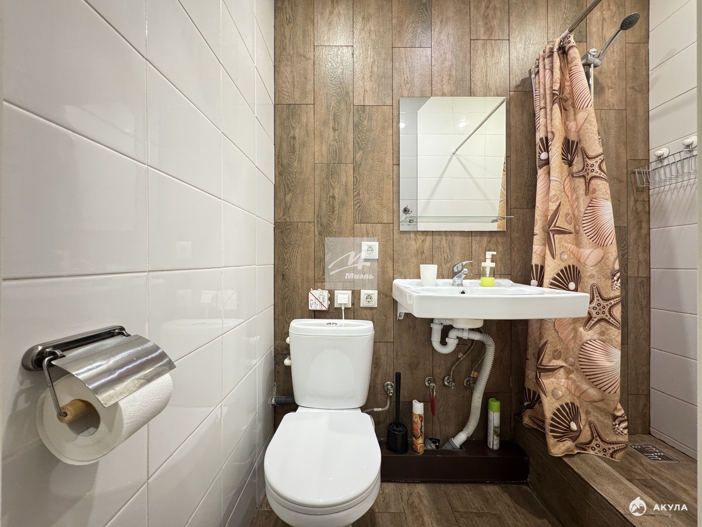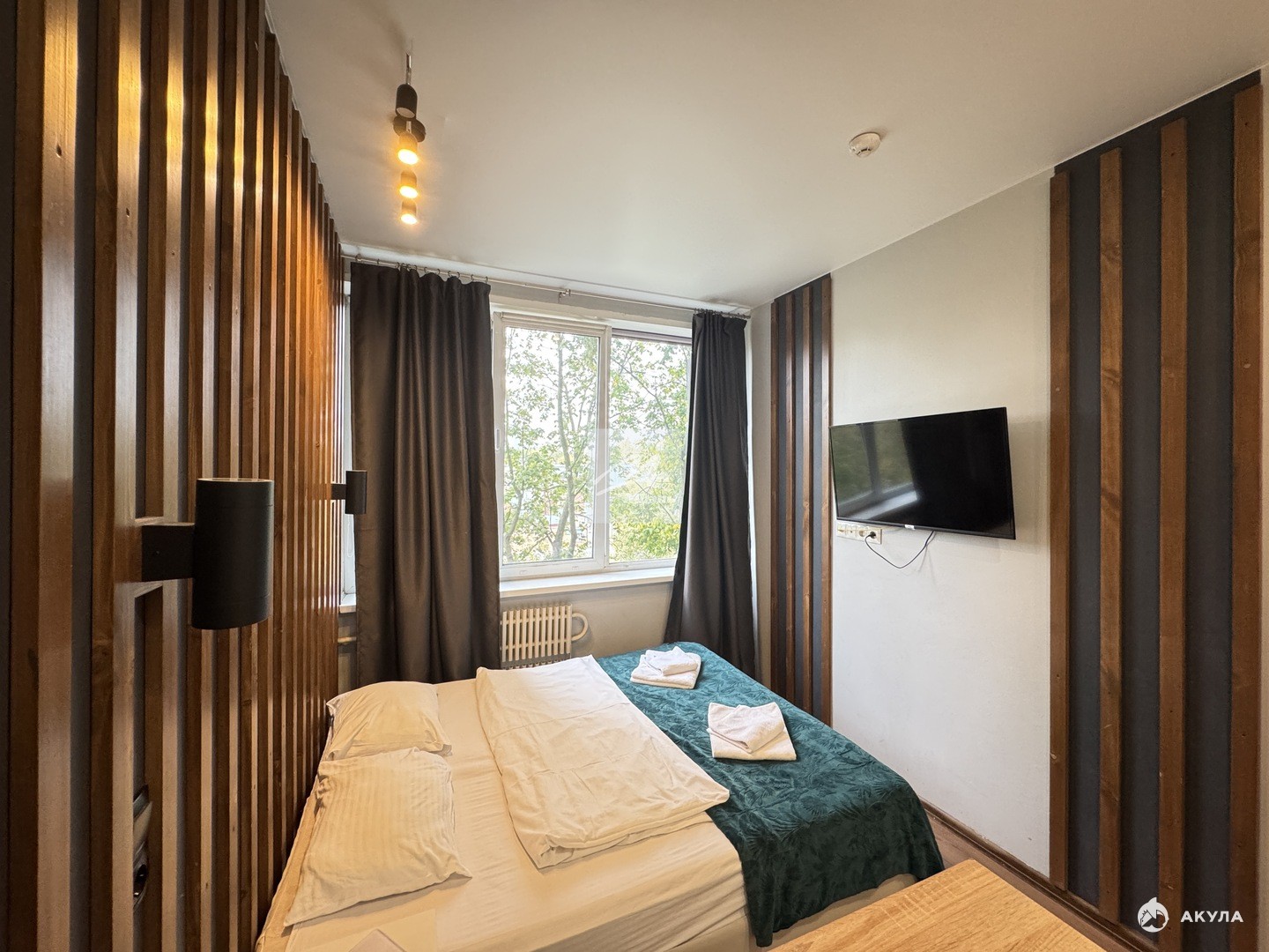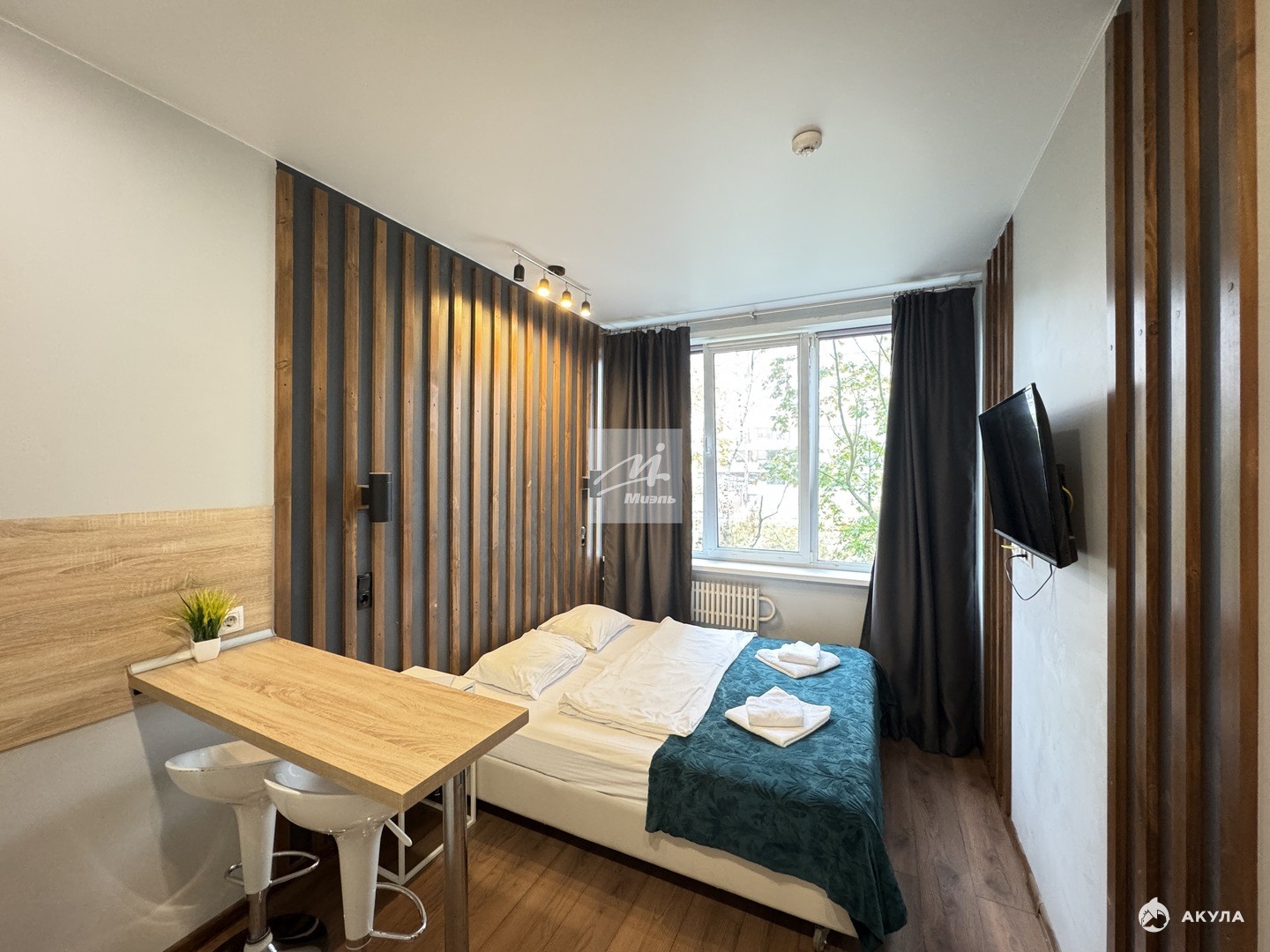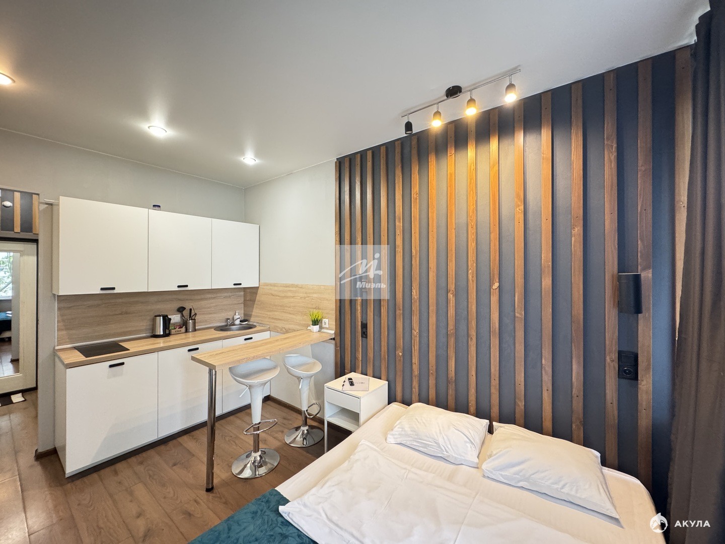 Апартаменты расположены на 3 этаже 6-этажного дома. В комнате находится зона кухни, большая кровать, стол, барные стулья, тумбочка, телевизор, санузел с душевой зоной.