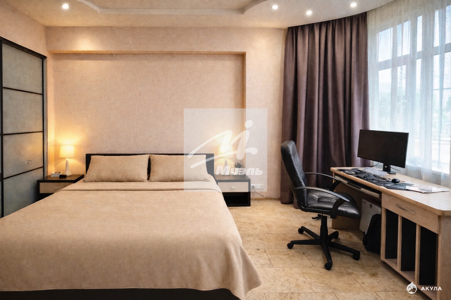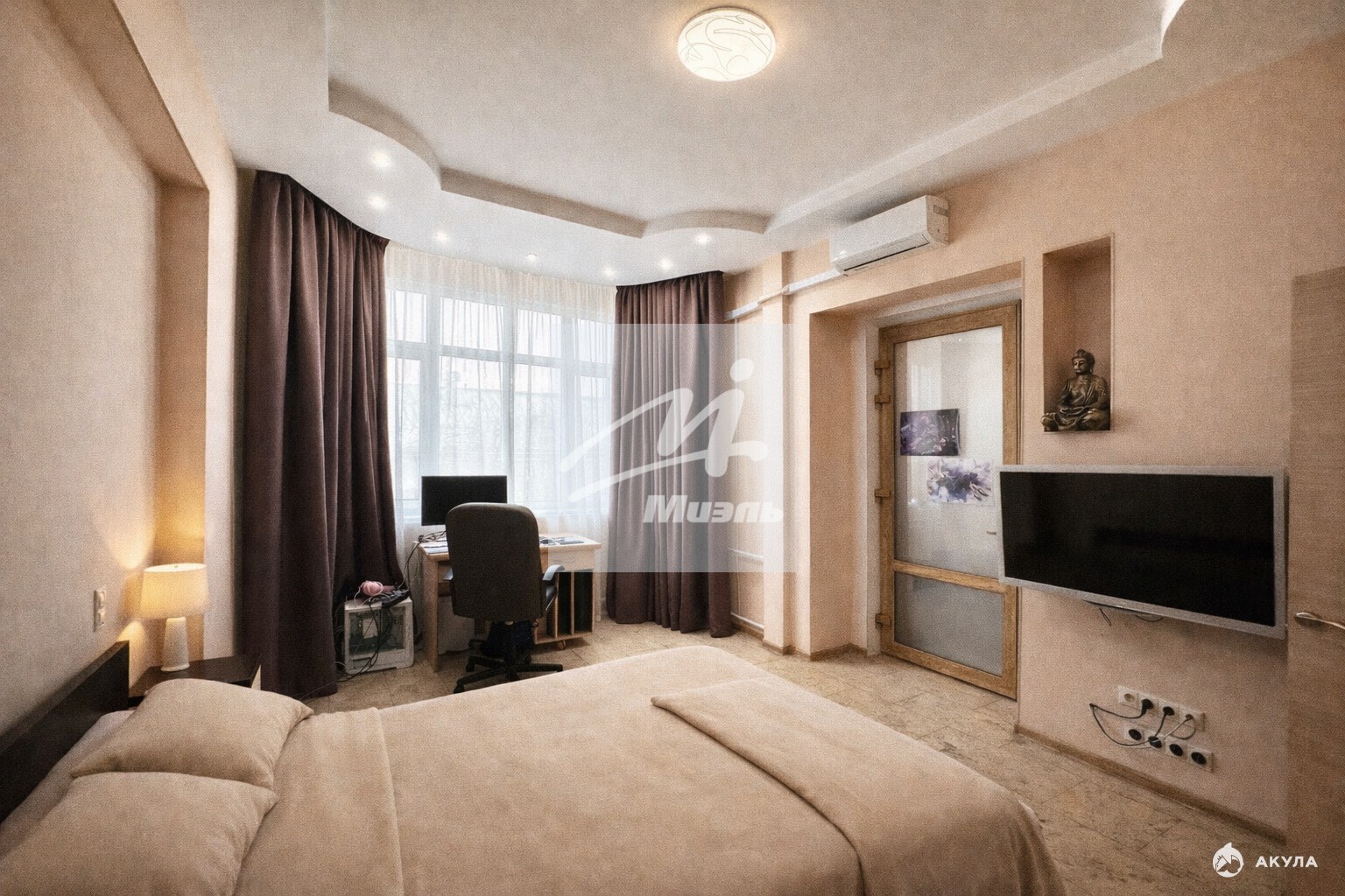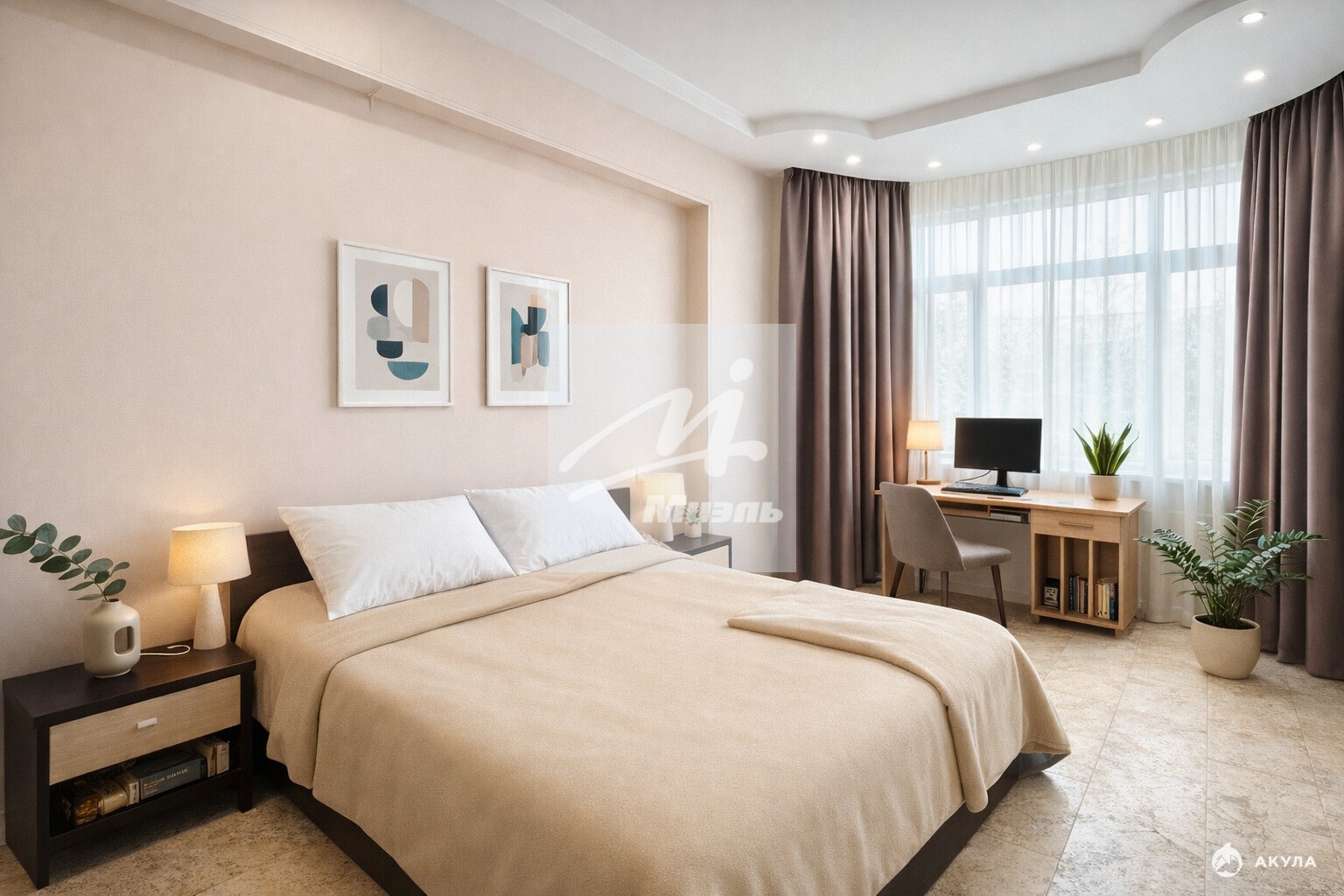 • Спальня (25 м²): Светлая комната с кондиционером и выверенными световыми и цветовыми акцентами.