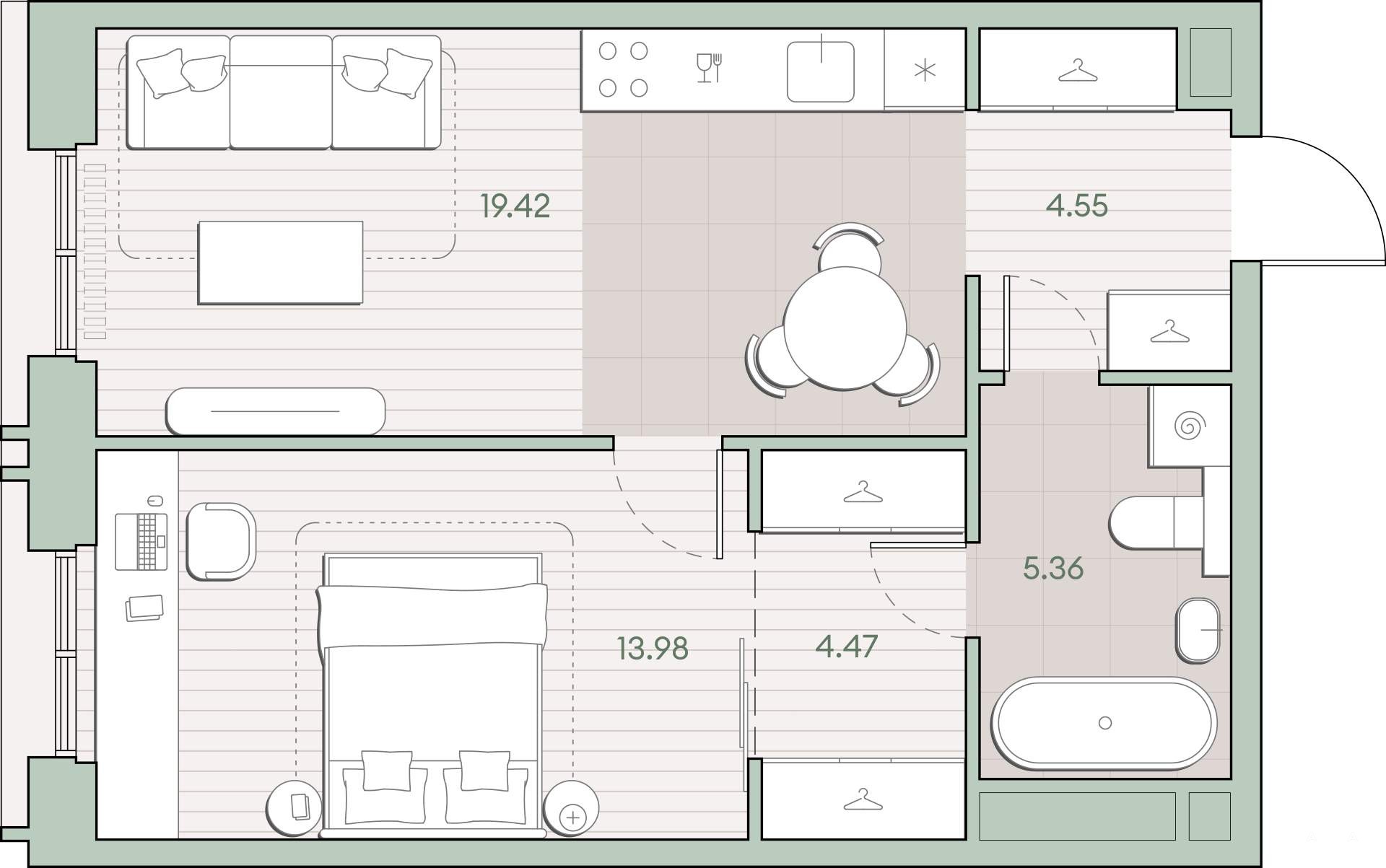 Жилая площадь 13.98 м2, кухня 19.42 м2, предчистовая отделка, комнаты изолированные.