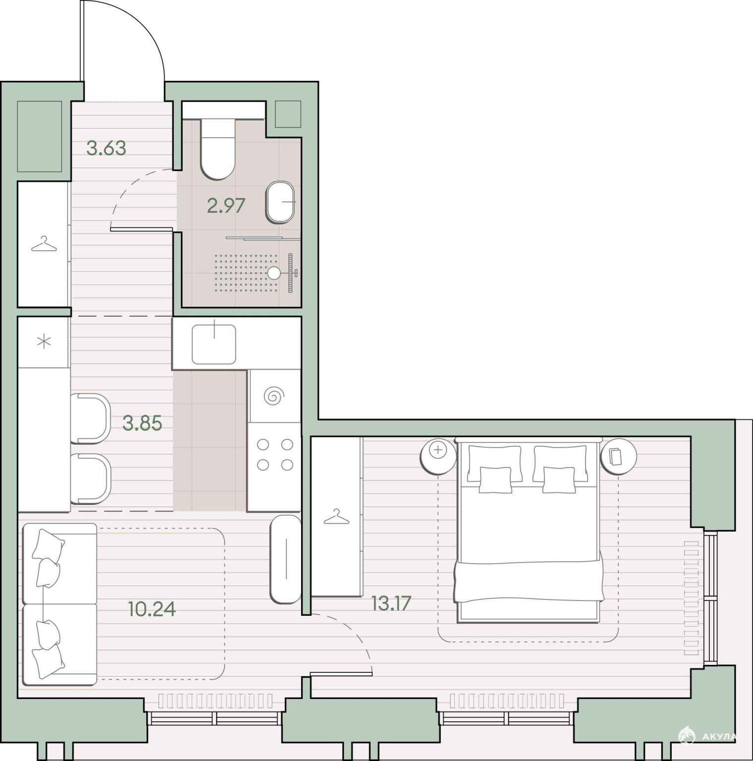 Жилая площадь 13.17 м2, предчистовая отделка, комнаты изолированные.