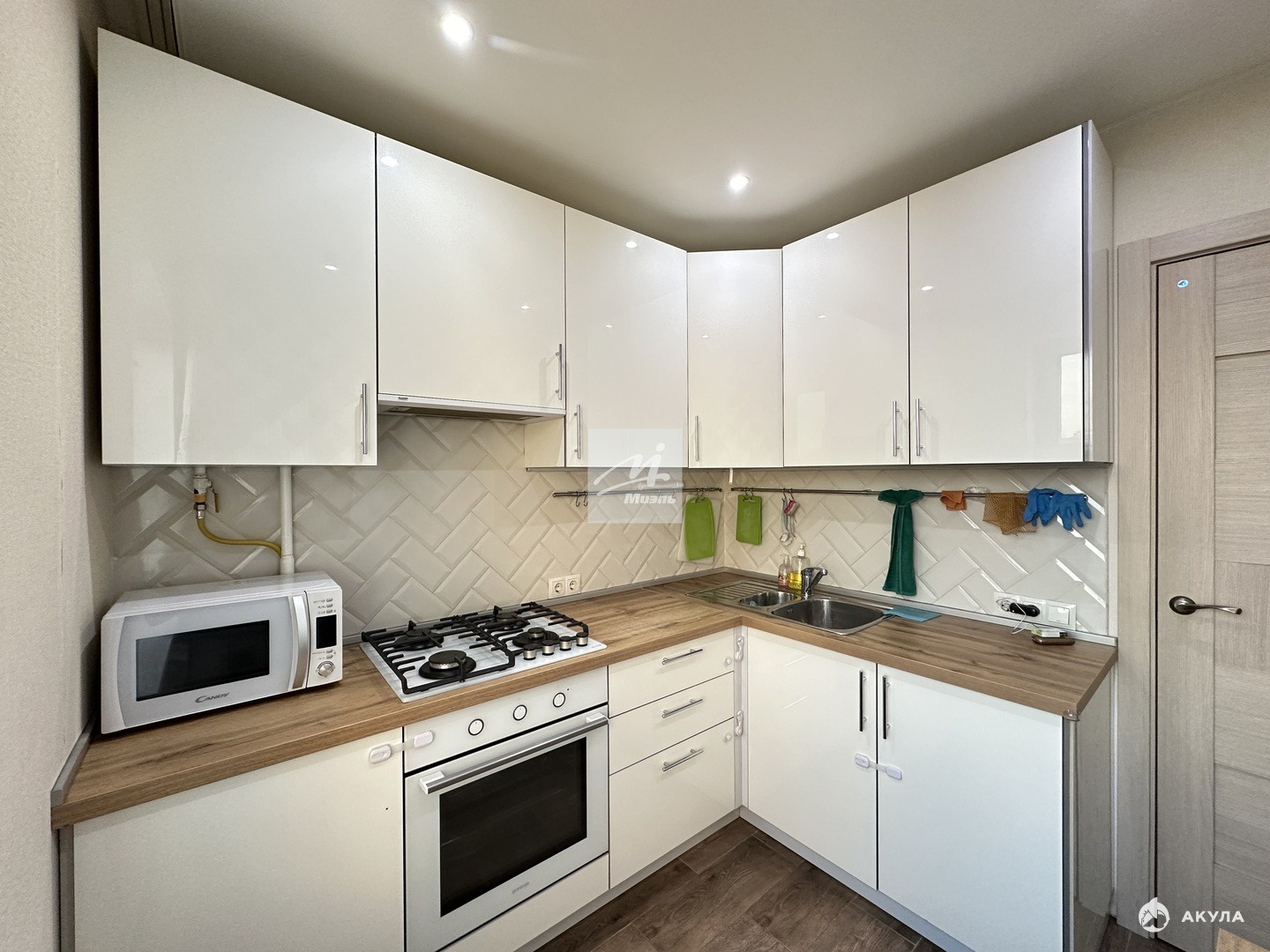 - Просторная комната с уютным интерьером, удобная кухня со встроенной мебелью и техникой.