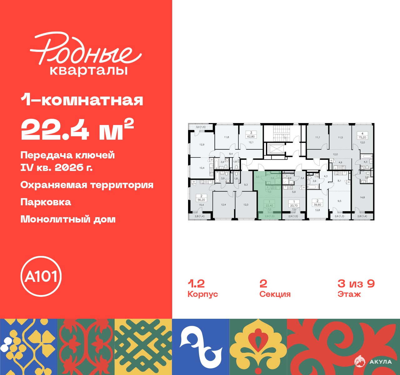 Дом монолитный, многоподъездный, высотой 9 этажей. Квартира находится в 1-й секции в корпусе 1.2. На этаже 6 квартир. В подъезде 1 грузовой лифт. Начало строительства - 4 квартал 2023 года. Окончание строительства - 4 квартал 2026 года. Оформление сделки по договору долевого участия.