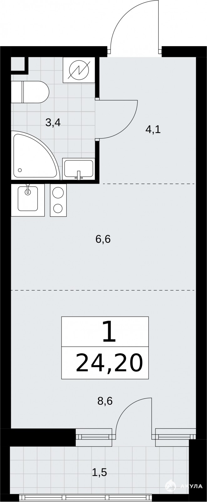 1-комн. квартира-студия с отделкой в ЖК "Родные кварталы" на 2 этаже. Общая площадь: 24.2 кв.м., площадь гостиной 15.2 кв.м., из которых 6.6 кв.м. выделено под кухонную зону. Все окна выходят на одну сторону. В квартире один балкон, один совмещенный санузел. Высота потолков 2.9 м.
