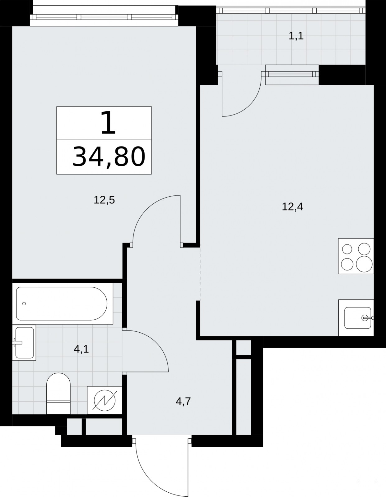 1-комн. квартира от застройщика с отделкой в ЖК "Родные кварталы" на 9 этаже. Общая площадь: 34.8 кв.м., жилая: 12.5 кв.м., площадь просторной кухни-столовой: 12.4 кв.м. Все окна выходят на одну сторону. В квартире одна лоджия, один совмещенный санузел. Высота потолков 2.9 м.