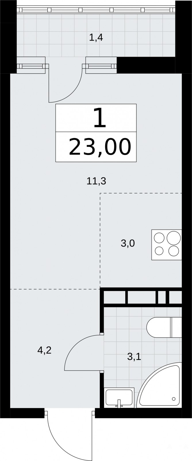 Продается однокомнатная квартира-студия с отделкой в ЖК "Родные кварталы" на 5 этаже. Общая площадь: 23 кв.м., площадь гостиной 14.3 кв.м., из которых 3 кв.м. выделено под кухонную зону. Все окна выходят на одну сторону. В квартире один балкон, один совмещенный санузел. Высота потолков 2.9 м.