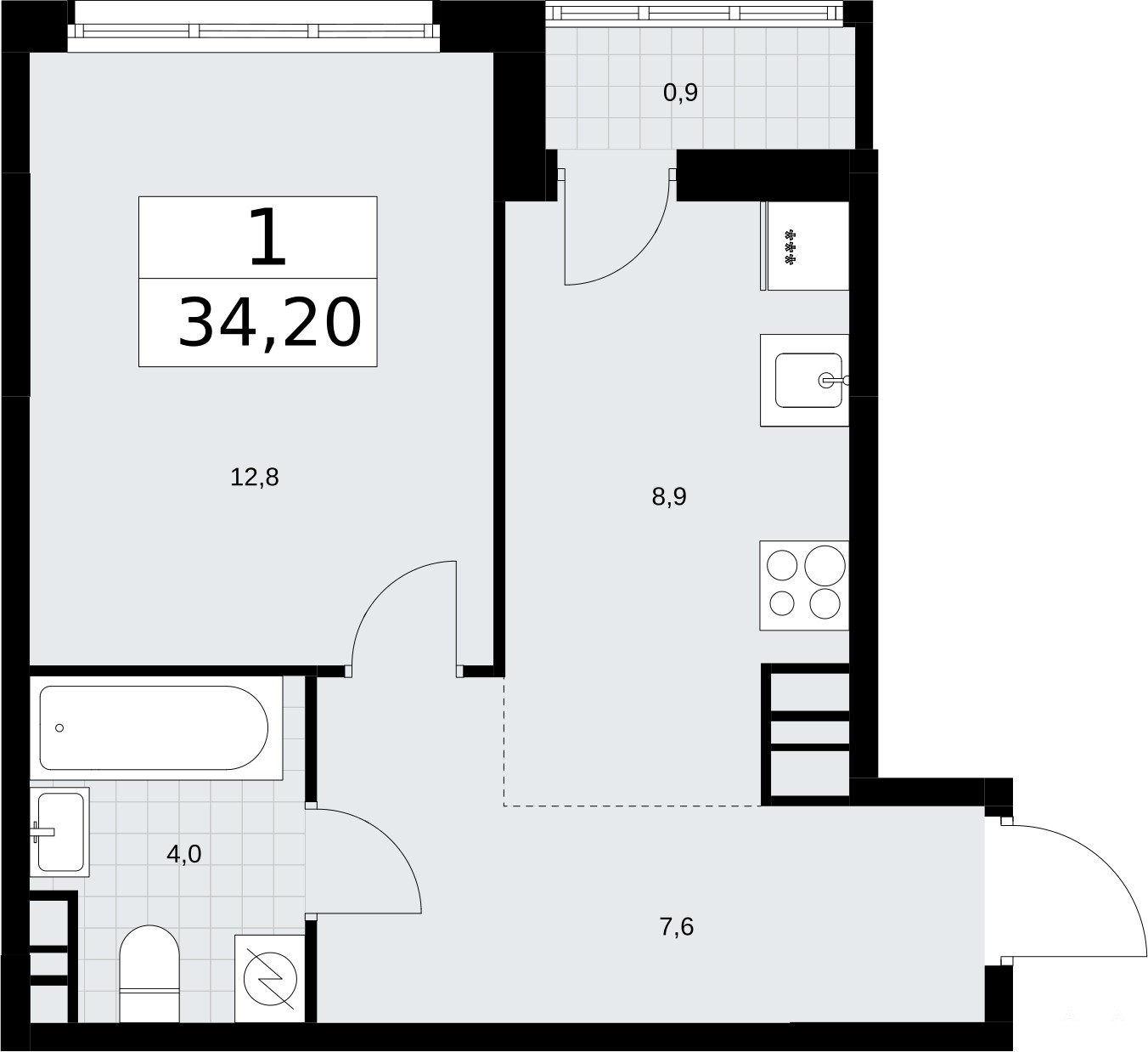 1-комн. квартира от застройщика с отделкой в ЖК "Родные кварталы" на 9 этаже. Общая площадь: 34.2 кв.м., жилая: 12.8 кв.м., площадь кухни: 8.9 кв.м. Все окна выходят на одну сторону. В квартире одна лоджия, один совмещенный санузел. Высота потолков 2.95 м.