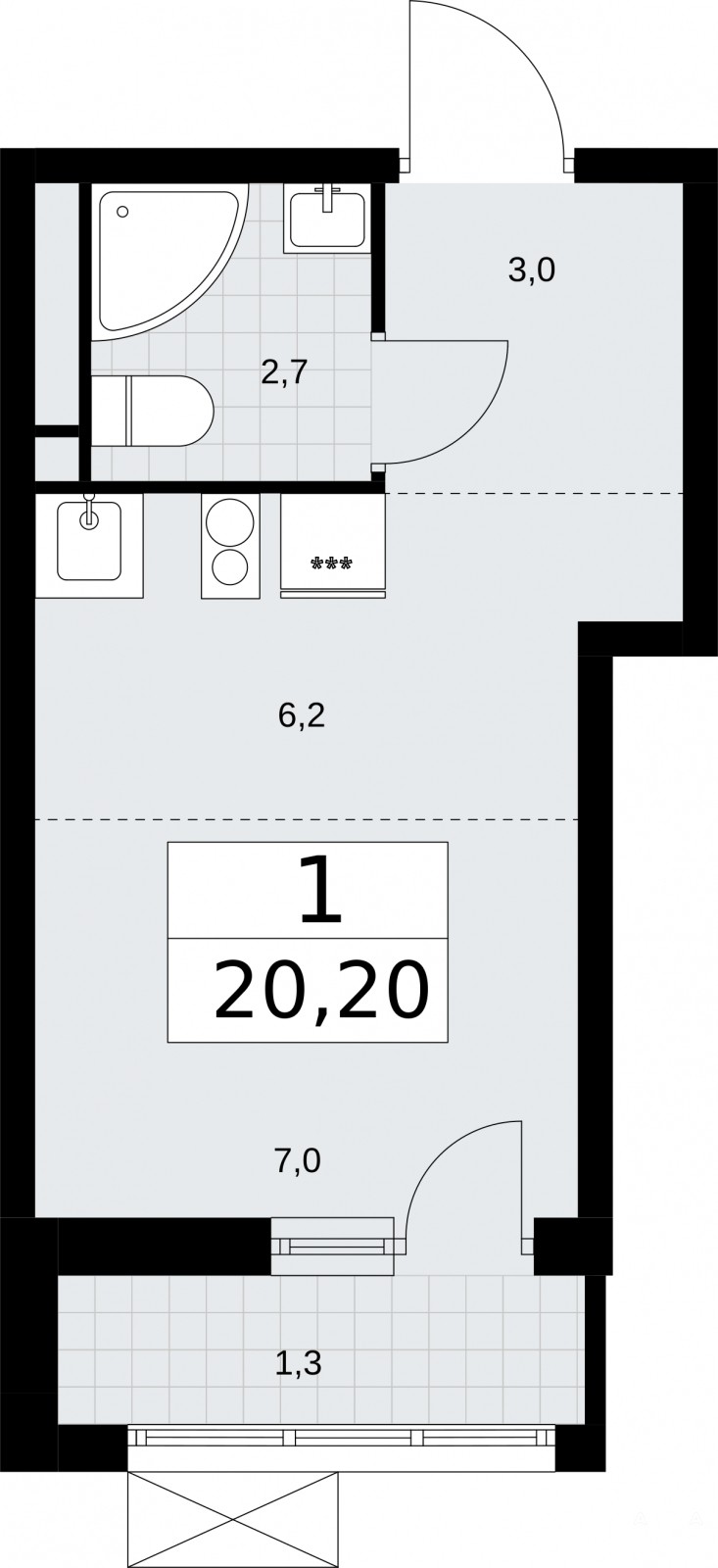1-комн. квартира-студия от застройщика в ЖК "Родные кварталы" на 6 этаже. Квартира без отделки, полностью готова к ремонту. Общая площадь: 20.2 кв.м., площадь гостиной 13.2 кв.м., из которых 6.2 кв.м. выделено под кухонную зону. Все окна выходят на одну сторону. В квартире один балкон, один совмещенный санузел. Высота потолков 2.9 м.