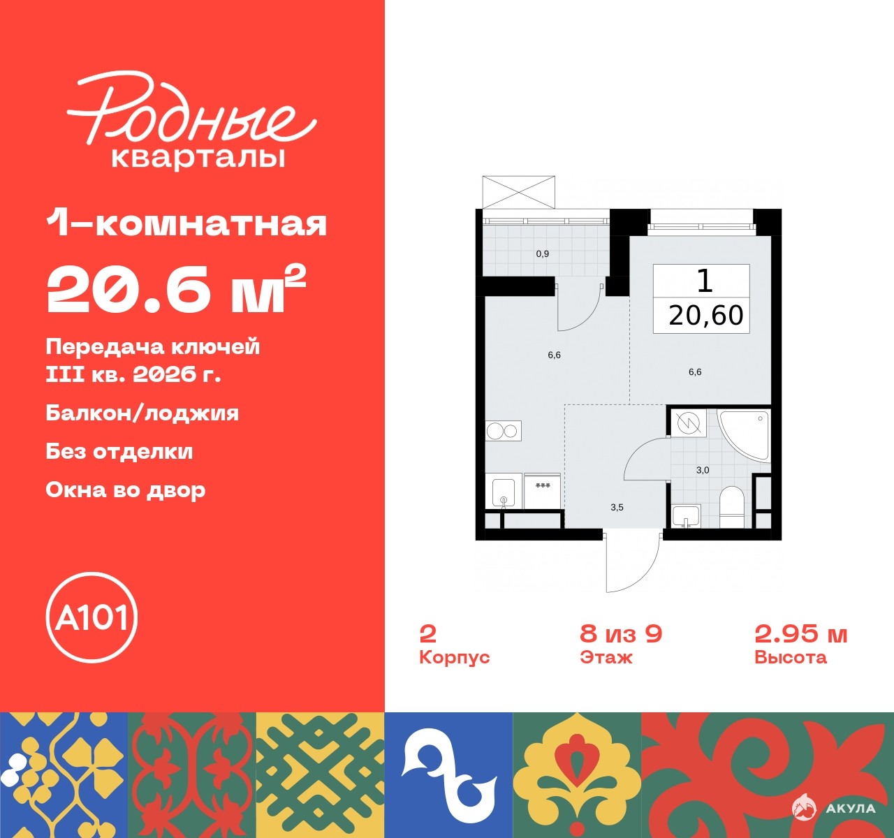 1-комн. квартира-студия от застройщика в ЖК "Родные кварталы" на 8 этаже. Квартира без отделки, после оформления собственности можно делать ремонт. Общая площадь: 20.6 кв.м., площадь гостиной 13.2 кв.м., из которых 6.6 кв.м. выделено под кухонную зону. Все окна выходят на одну сторону. В квартире одна лоджия, один совмещенный санузел. Высота потолков 2.9 м.