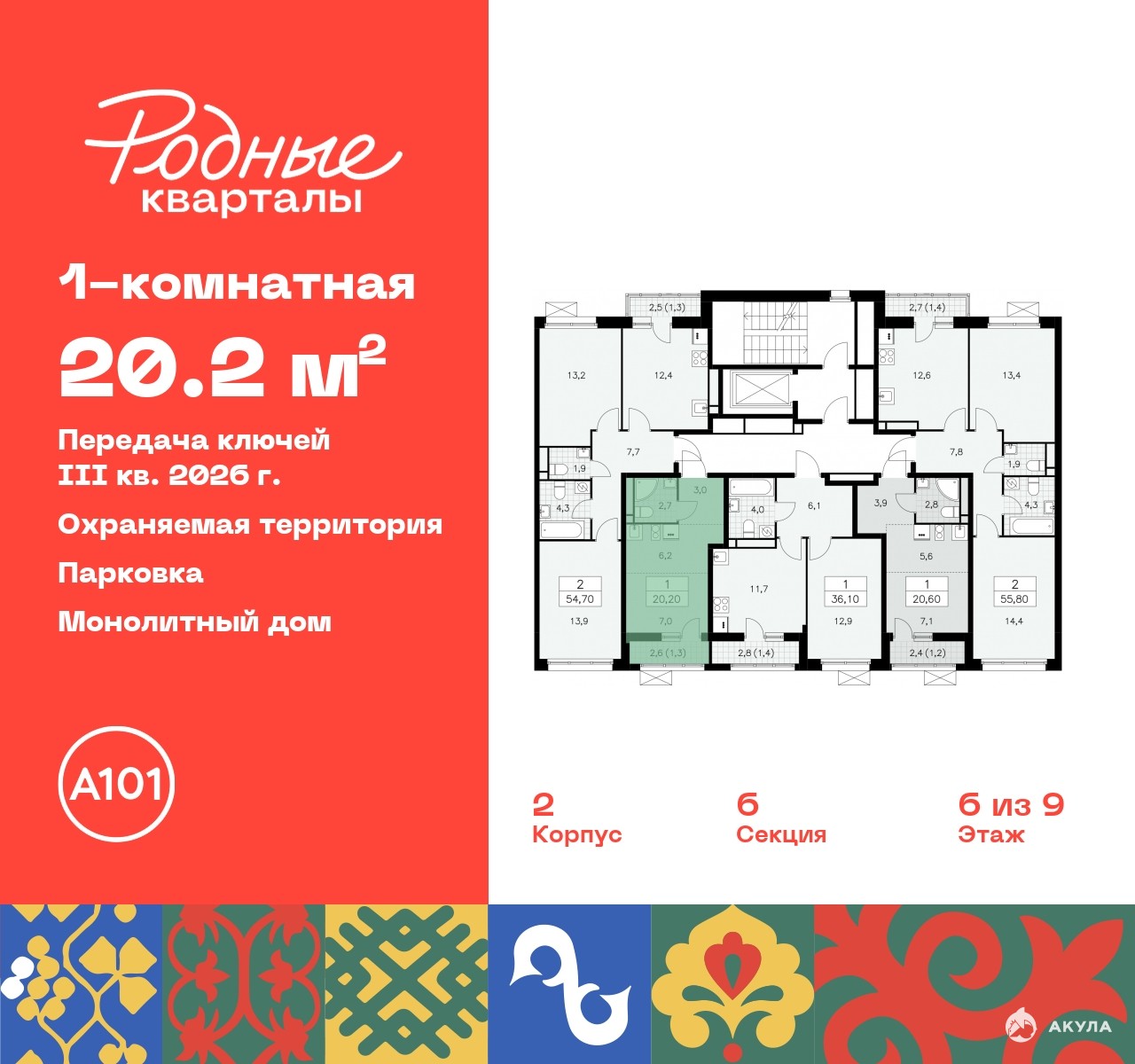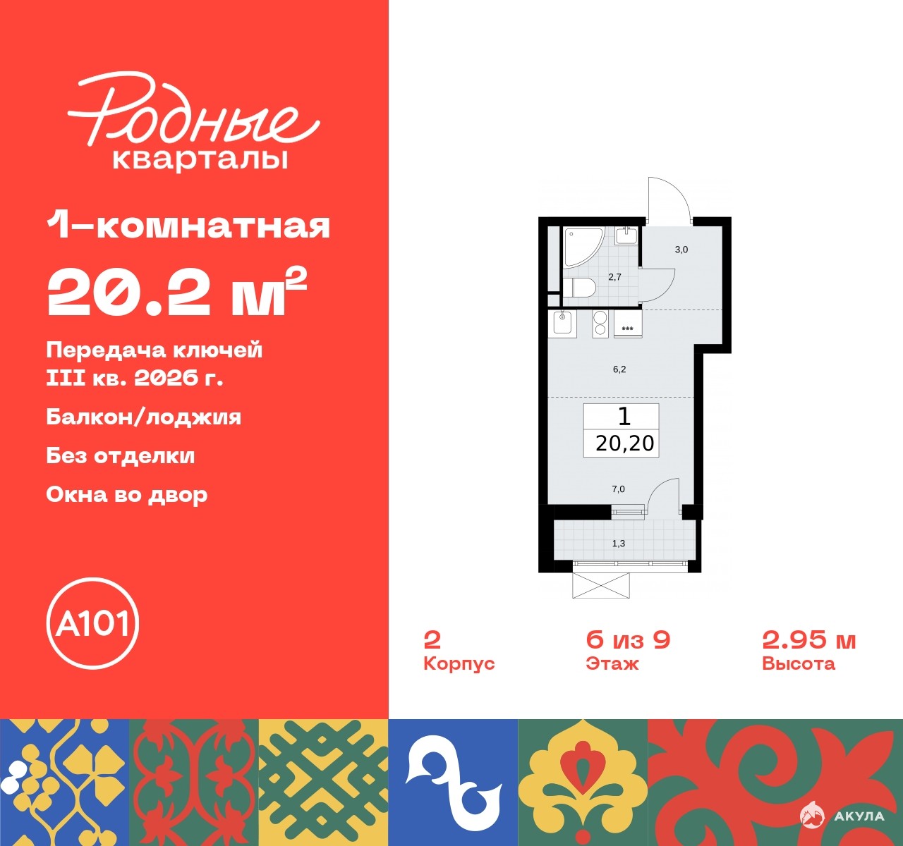 Продается 1-комн. квартира-студия в ЖК "Родные кварталы" на 6 этаже. Квартира без отделки, новый владелец может сделать ремонт по своему дизайн-проекту. Общая площадь: 20.2 кв.м., площадь гостиной 13.2 кв.м., из которых 6.2 кв.м. выделено под кухонную зону. Все окна выходят на одну сторону. В квартире один балкон, один совмещенный санузел. Высота потолков 2.9 м.