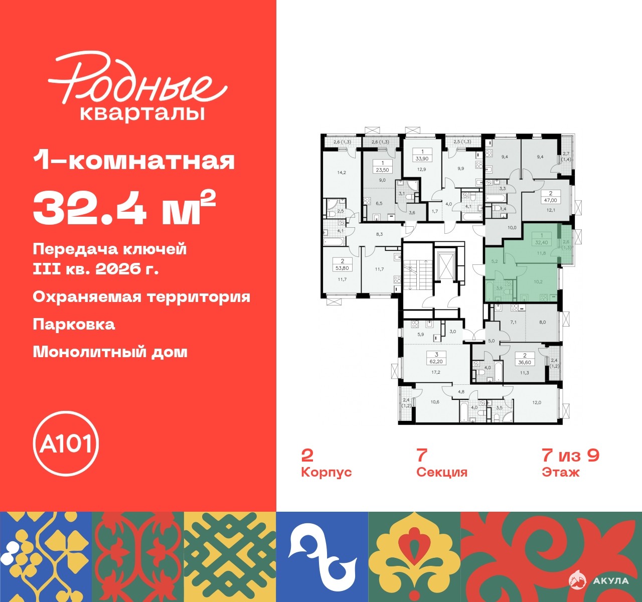 Просторная 1-комн. квартира в ЖК "Родные кварталы" на 7 этаже. Квартира без отделки, после выдачи ключей можно делать ремонт. Общая площадь: 32.4 кв.м., жилая: 11.8 кв.м., площадь просторной кухни-столовой: 10.2 кв.м. Все окна выходят на одну сторону. В квартире один балкон, один совмещенный санузел. Высота потолков 2.9 м.