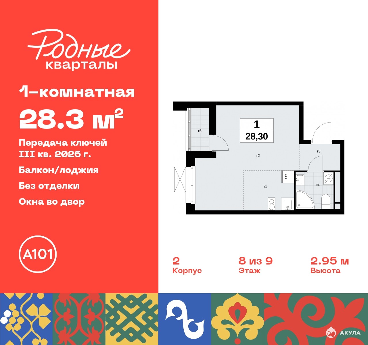 Продается 1-комн. квартира-студия от застройщика в ЖК "Родные кварталы" на 8 этаже. Квартира без отделки, полностью готова к ремонту. Общая площадь: 28.3 кв.м., площадь гостиной 21.8 кв.м., из которых 4.6 кв.м. выделено под кухонную зону. Все окна выходят на одну сторону. В квартире одна лоджия, один совмещенный санузел. Высота потолков 2.9 м.