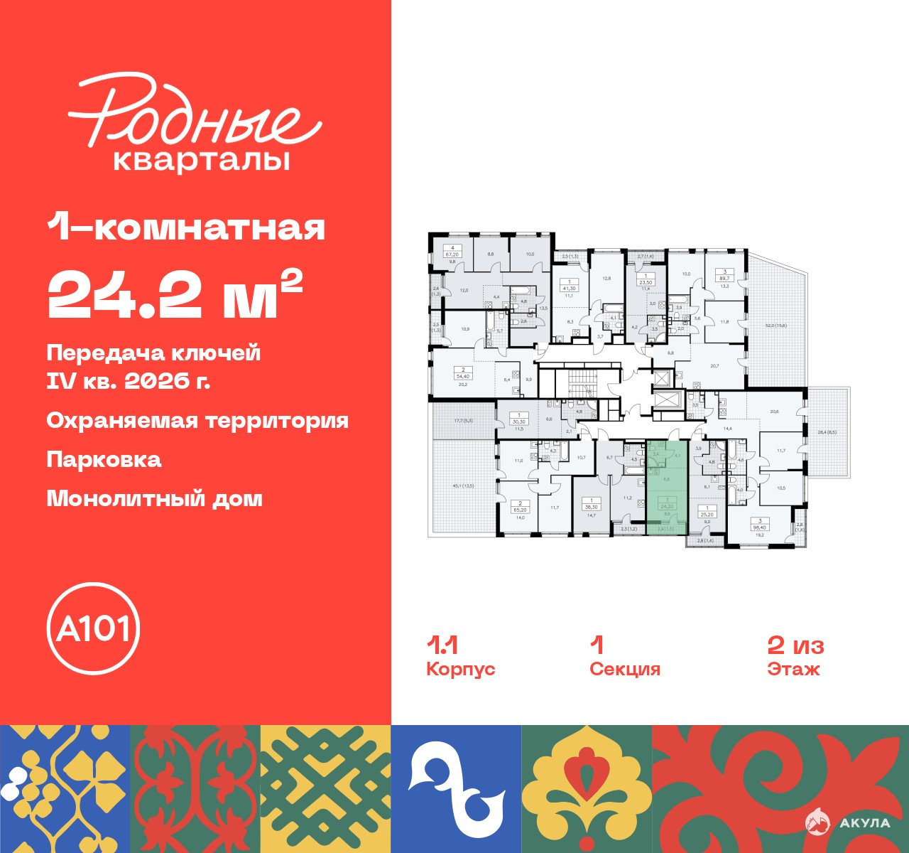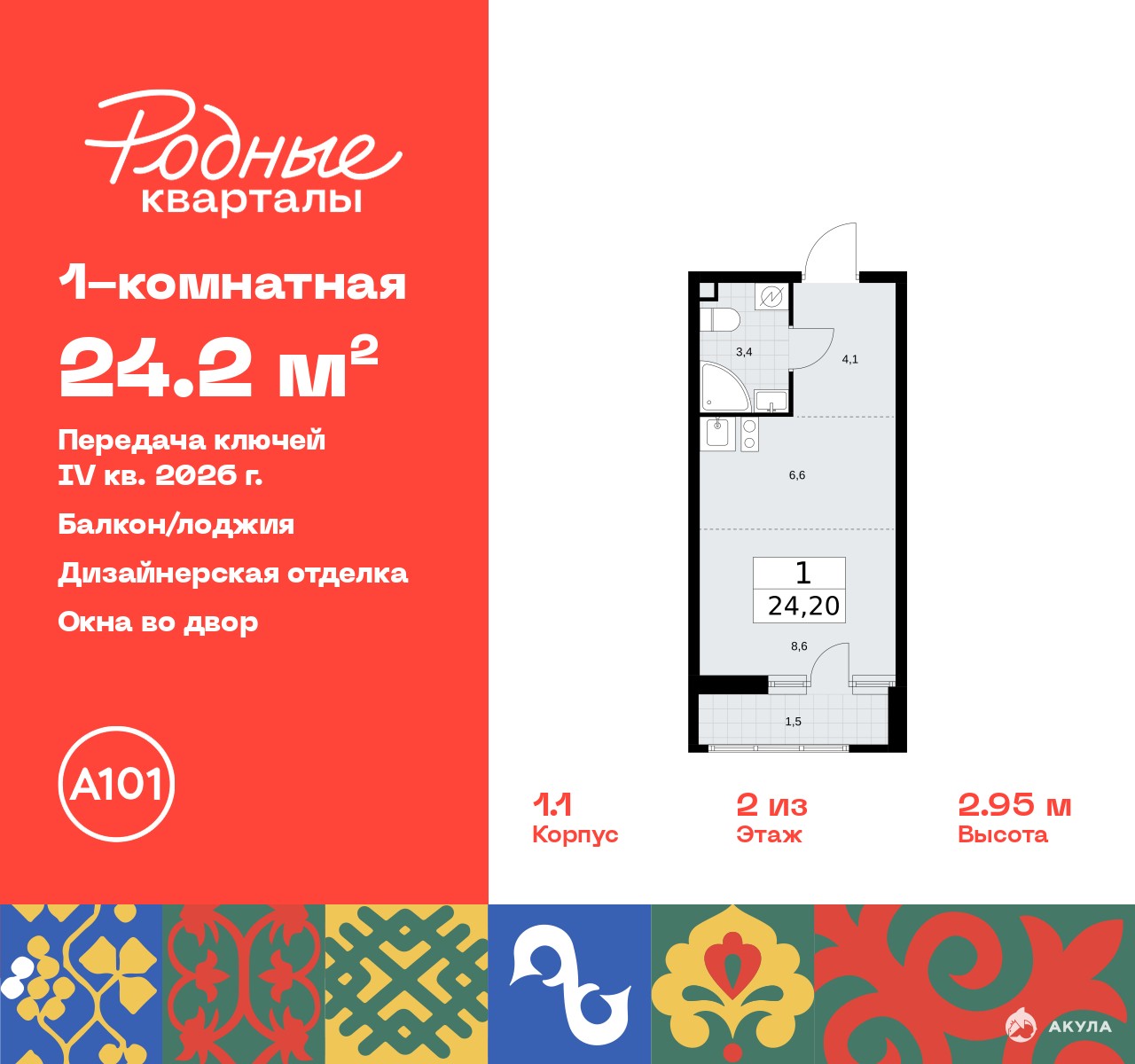 Продается 1-комн. квартира-студия от застройщика с отделкой в ЖК "Родные кварталы" на 2 этаже. Общая площадь: 24.2 кв.м., площадь гостиной 15.2 кв.м., из которых 6.6 кв.м. выделено под кухонную зону. Все окна выходят на одну сторону. В квартире один балкон, один совмещенный санузел. Высота потолков 2.9 м.
