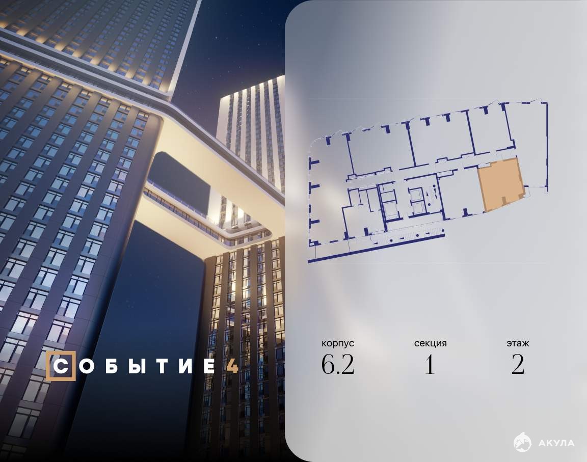 Продаётся 1-комнатная квартира от застройщика: общая площадь 45.30 м, жилая 15.20 м, кухня 22.40 м, 2-й этаж, жилой квартал «Событие-6», корпус 2 (секция 1) Срок сдачи: 1 квартал 2029 года.