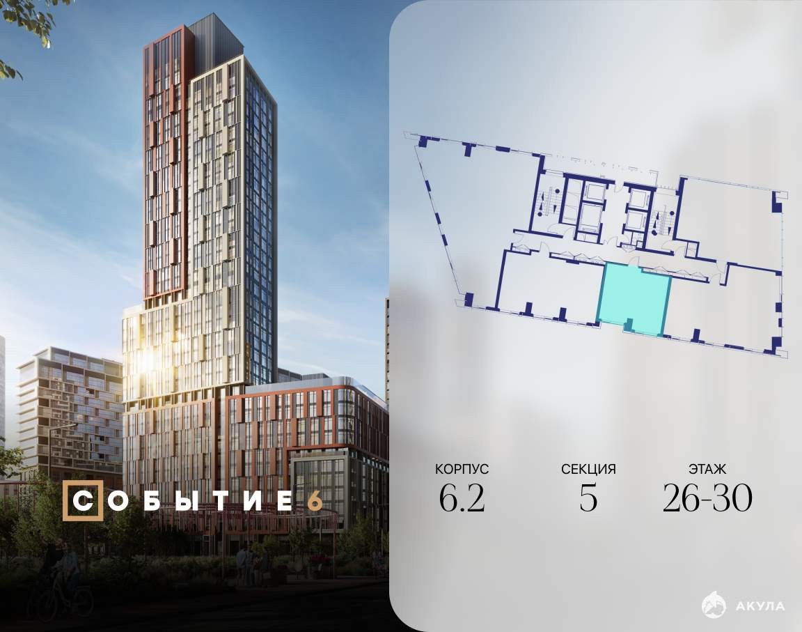 Продаётся 1-комнатная квартира от застройщика: общая площадь 38.80 м, жилая 14.90 м, кухня 16.00 м, 26-й этаж, жилой квартал «Событие-6», корпус 2 (секция 5) Срок сдачи: 1 квартал 2029 года.