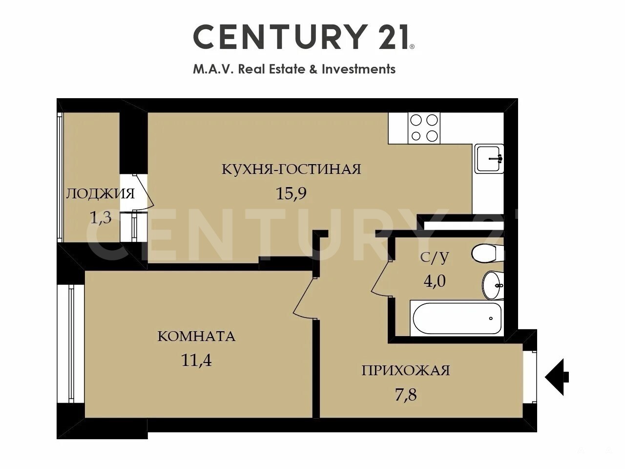· Кухня-гостиная: 15, 9 м² + выход на лоджию (отличное место для кофе или рабочего кабинета).