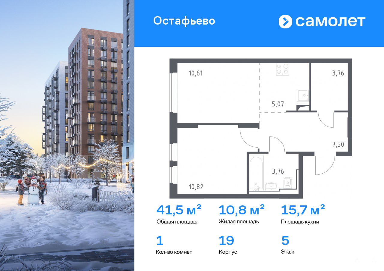 Строим кварталы для жизни с заботой о будущем. Предлагается 1-комнатная квартира комфорт-класса 41, 52 кв.м в корпусе 19 на 5 этаже, в ЖК «Остафьево»