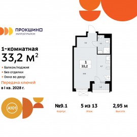 1-комн. квартира-студия от застройщика в ЖК "Прокшино" на 5 этаже. Квартира без отделки, полностью готова к ремонту. Общая площадь: 33.2 кв.м., площадь гостиной 23.5 кв.м., из которых 6.7 кв.м. выделено под кухонную зону. Все окна выходят на одну сторону. В квартире одна лоджия, один...