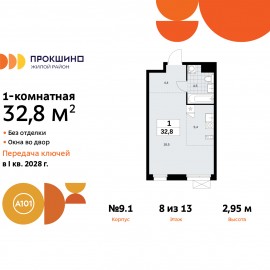 1-комн. квартира-студия в ЖК "Прокшино" на 13 этаже. Квартира без отделки, после получения ключей можно делать ремонт. Общая площадь: 31.2 кв.м., площадь гостиной 22.6 кв.м., из которых 5.8 кв.м. выделено под кухонную зону. Все окна выходят на одну сторону. В квартире один совмещенный...