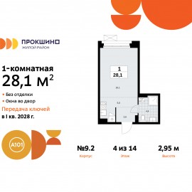 Просторная 1-комн. квартира-студия в ЖК "Прокшино" на 4 этаже. Квартира без отделки, после оформления собственности можно делать ремонт. Общая площадь: 28.1 кв.м., площадь гостиной 21.1 кв.м., из которых 5 кв.м. выделено под кухонную зону. Все окна выходят на одну сторону. В квартире...