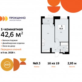 Продается однокомнатная квартира от застройщика с отделкой в ЖК "Прокшино" на 17 этаже. Общая площадь: 42.6 кв.м., жилая: 16 кв.м., площадь просторной кухни-столовой: 17.5 кв.м. Все окна выходят на одну сторону. В квартире одна лоджия, один совмещенный санузел. Высота потолков 2.95...