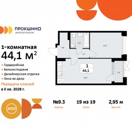 Однокомнатная квартира от застройщика с отделкой в ЖК "Прокшино" на 12 этаже. Общая площадь: 44.2 кв.м., жилая: 11.9 кв.м., площадь просторной кухни-столовой: 19.8 кв.м. Все окна выходят на одну сторону. В квартире одна лоджия, один совмещенный санузел. Высота потолков 2.95 м. Эта...