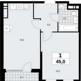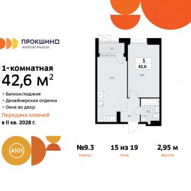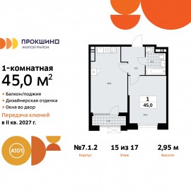 1-комн. квартира с отделкой в ЖК "Прокшино" на 15 этаже. Общая площадь: 45 кв.м., жилая: 15.2 кв.м., площадь просторной кухни-столовой: 19.2 кв.м. Все окна выходят на одну сторону. В квартире одна лоджия, один совмещенный санузел. Высота потолков 2.95 м. Дом монолитный, трехподъездный,...