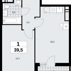 Продается 1-комн. квартира от застройщика с отделкой в ЖК "Прокшино" на 15 этаже. Общая площадь: 39.5 кв.м., жилая: 13.7 кв.м., площадь просторной кухни-столовой: 16.3 кв.м. Все окна выходят на одну сторону. В квартире одна лоджия, один совмещенный санузел. Высота потолков 2.95 м. Дом...