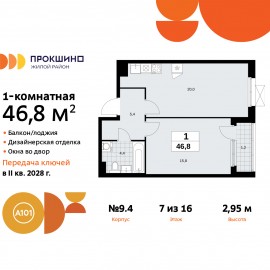Продается однокомнатная квартира от застройщика с отделкой в ЖК "Прокшино" на 7 этаже. Общая площадь: 46.8 кв.м., жилая: 15.8 кв.м., площадь просторной кухни-столовой: 20 кв.м. Все окна выходят на одну сторону. В квартире одна лоджия, один совмещенный санузел. Высота потолков 2.95 м. Эта...