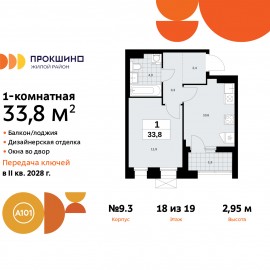 Продается однокомнатная квартира с отделкой в ЖК "Прокшино" на 19 этаже. Общая площадь: 33.8 кв.м., жилая: 11.9 кв.м., площадь просторной кухни-столовой: 10.6 кв.м. Все окна выходят на одну сторону. В квартире одна лоджия, один совмещенный санузел. Высота потолков 2.95 м. Эта квартира...