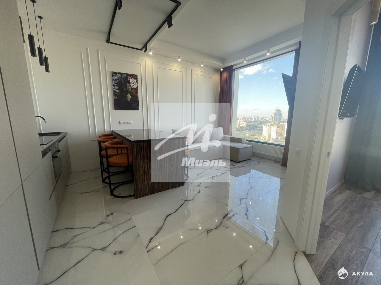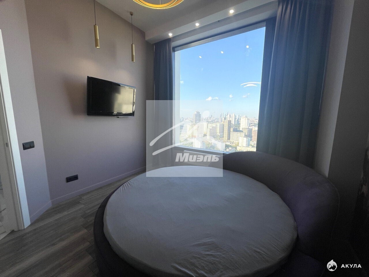 Квартира с дизайнерской отделкой расположена на 33-м этаже. Интерьер укомплектован мебелью, кухня оснащена электробытовой техникой. Планировка: просторная кухня-гостиная, спальня с гардеробной комнатой. Из окон открывается панорамный вид на город.