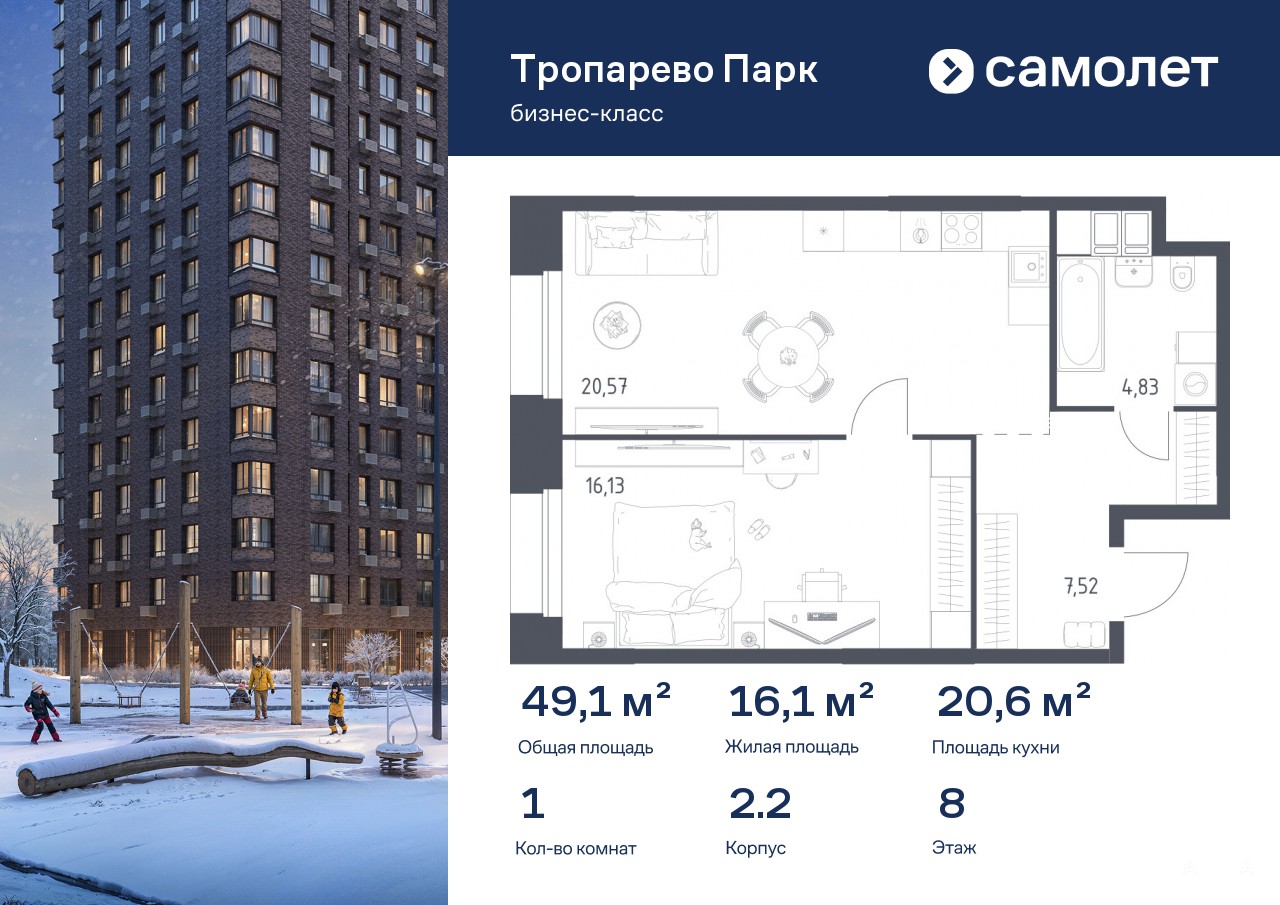 Строим кварталы для жизни с заботой о будущем. Предлагаются 1-комнатные апартаменты бизнес-класса 49, 05 кв.м в корпусе 2.2 на 8 этаже, в МФК «Тропарево Парк»