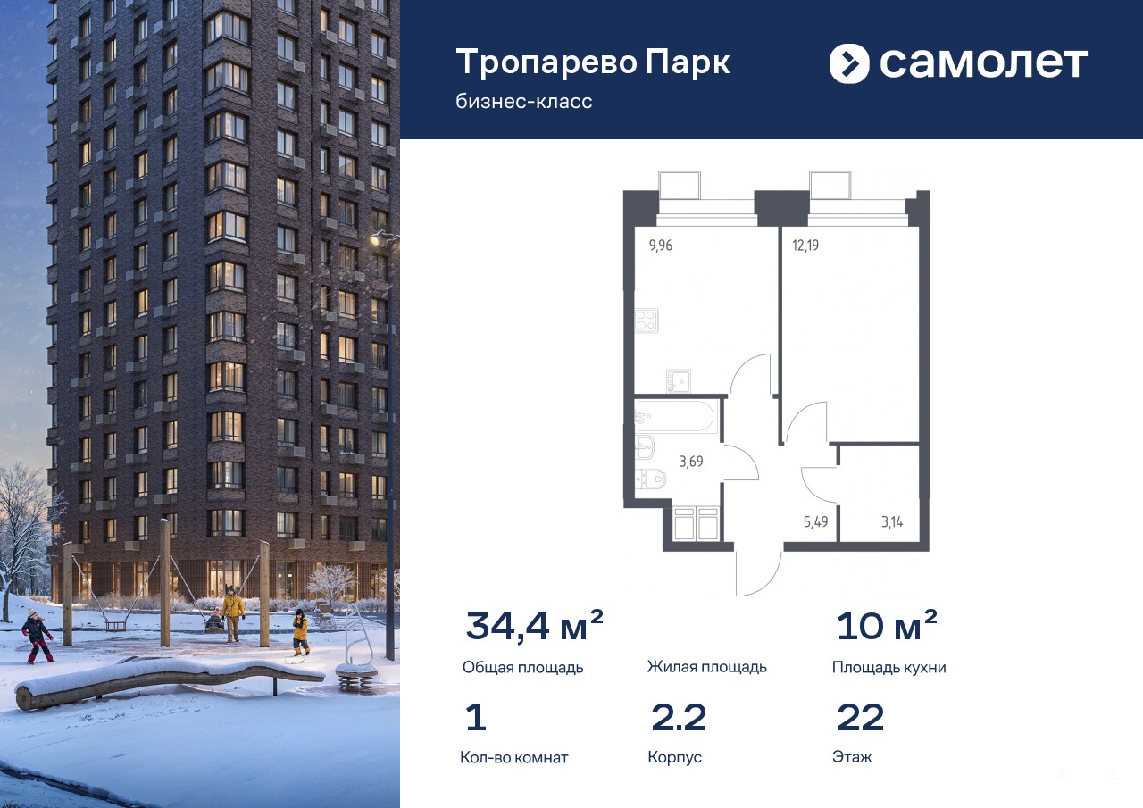 Строим кварталы для жизни с заботой о будущем. Предлагаются 1-комнатные апартаменты бизнес-класса 34, 38 кв.м в корпусе 2.2 на 22 этаже, в МФК «Тропарево Парк»