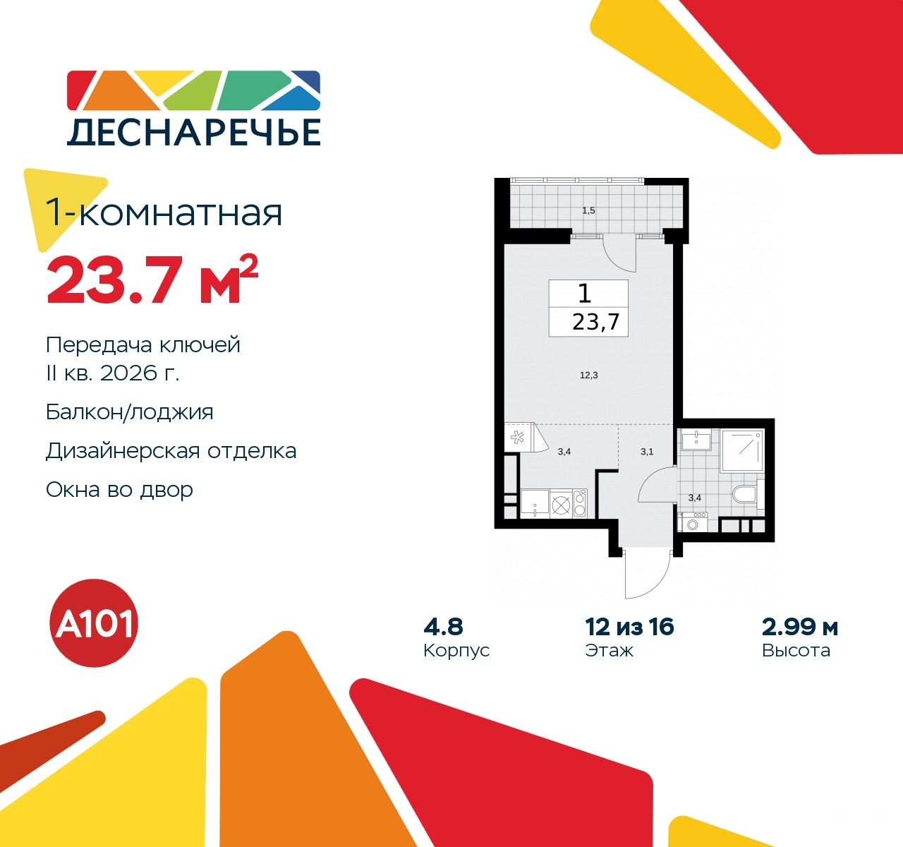 Однокомнатная квартира-студия с отделкой в ЖК "Деснаречье" на 12 этаже. Общая площадь: 23.7 кв.м., площадь гостиной 15.7 кв.м., из которых 3.4 кв.м. выделено под кухонную зону. Все окна выходят на одну сторону. В квартире один балкон, один совмещенный санузел. Высота потолков 2.99 м.