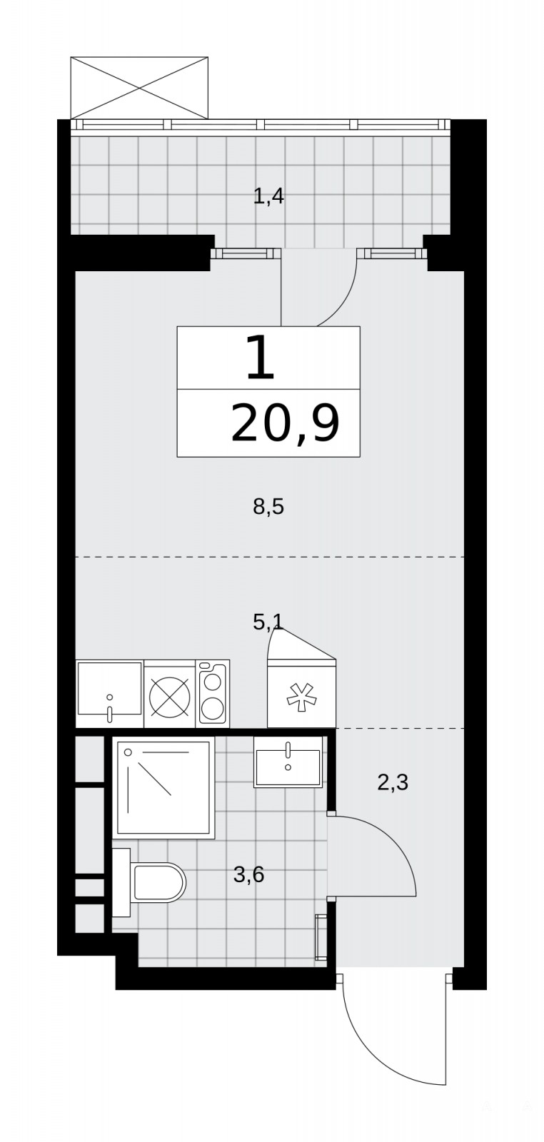 Продается 1-комн. квартира-студия в ЖК "Деснаречье" на 15 этаже. Квартира без отделки, новый владелец может сделать ремонт по индивидуальному дизайн-проекту. Общая площадь: 20.9 кв.м., площадь гостиной 13.6 кв.м., из которых 5.1 кв.м. выделено под кухонную зону. Все окна выходят на одну сторону. В квартире один балкон, один совмещенный санузел. Высота потолков 2.99 м.